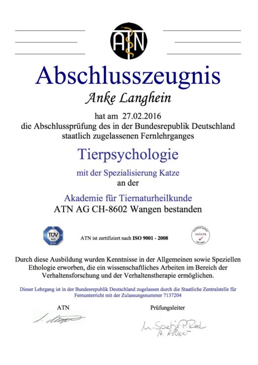 2015 Fernstudium Tierpsychologie Fachrichtung Katze an der ATN mit erfolgreichem Abschluss am 27.Februar 2016. Schülernummer: S66668